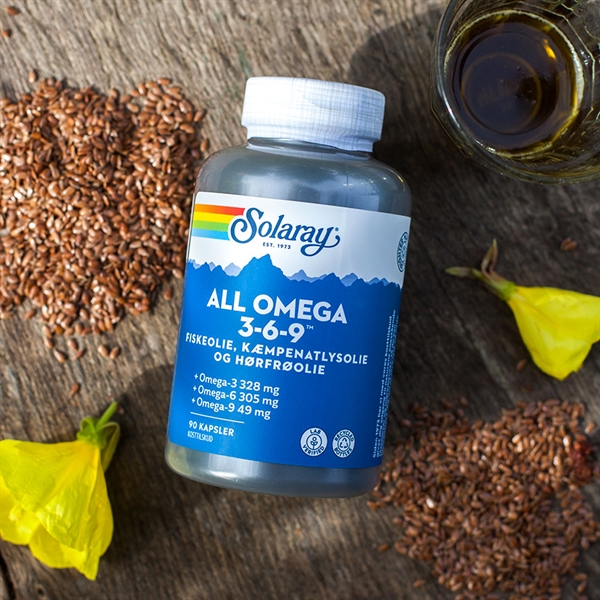 90 kapsler. All Omega 3-6-9 Solaray med kæmpenatlys- og hørfrøolie. Alle fiskeolier er i flg. lovgivningen testet for tungmetaller og pesticider. Kapsel fra kalv. Natur Energi.