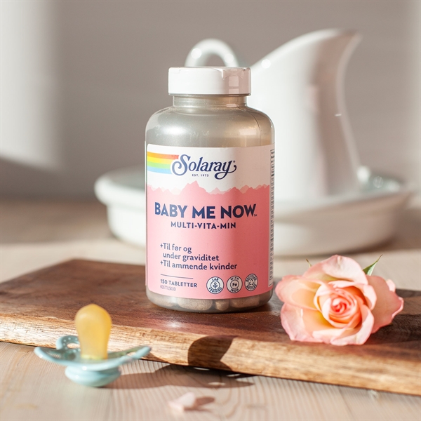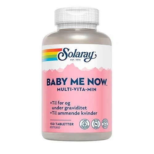 150 tabletter. Baby Me Now er en multivitamin/mineral tablet til før og under graviditet og til ammende kvinder. Indeholder 400 mcg Folsyre. LabVerified. Natur Energi.