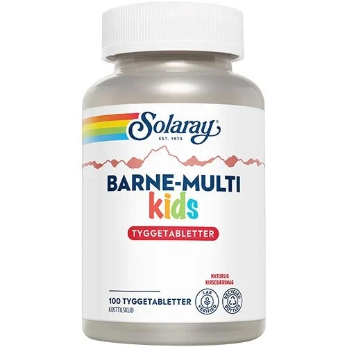 100 tabletter Barne-Multi er en tyggetablet med en dejlig smag af kirsebær, som indeholder 12 forskellige vitaminer og mineralet jern. Solaray