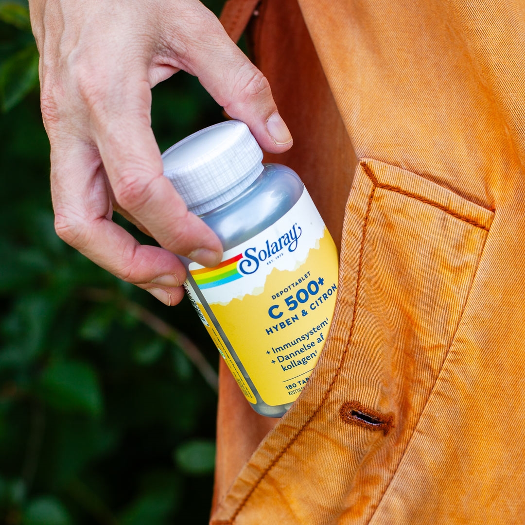 180 vegetabilske depottabletter. C 500+ Hyben & Citron Solaray frigives løbende over 12 timer. Vitamin C bidrager til immunsystemets normale funktion også under og efter intensiv fysisk træning, bidrager til at beskytte cellerne mod oxidativt stress og til dannelse af kollagen. Vegansk. LabVerified. Natur Energi.