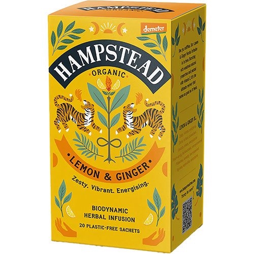 Økologisk og Demeter-certificeret Citron & Ingefær Te fra Hampstead Tea med ingefær og citronskal giver en krydret, frisk smag i plastikfri emballage.