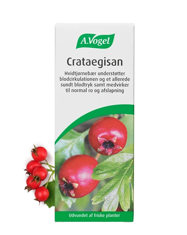 100 ml. Crataegisan A. Vogel kosttilskud, urtetilskud tinktur med udtræk af friske hvidtjørnebær understøtter blodcirkulationen og et allerede sundt blodtryk, afslappende, beroligende. Indeholder alkohol. 1 ml svarer til ca. 40 dråber. A. Vogel.