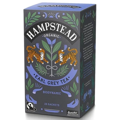 Økologisk, Demeter- og Fairtrade-certificeret Earl Grey Te fra Hampstead Tea med Darjeeling og bergamot giver blød citrus-smag i plastikfri emballage.