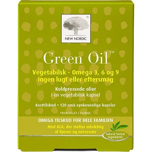 120 vegetabilske synkevenlige kapsler. Kosttilskud. Green Oil af koldt pressede olier fra hørfrø, kæmpenatlysblomst og rapsfrø, som indeholder vegetabilsk Omega-3, -6 og -9. Ikke tilsat smagsstoffer. Gluten, hvede og laktosefri. New Nordic Healthcare ApS.