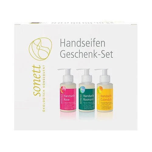 3 x 110 ml med pumpe. Håndsæbe Gavesæt Rose, Rosmarin & Morgenfrue Sonett indeholder 3 flydende håndsæber med rose, rosmarin og morgenfrue. Udtørrer desuden ikke hænderne. Kan anvendes til hænder, ansigt og resten af kroppen. Vegan. NatureSource.