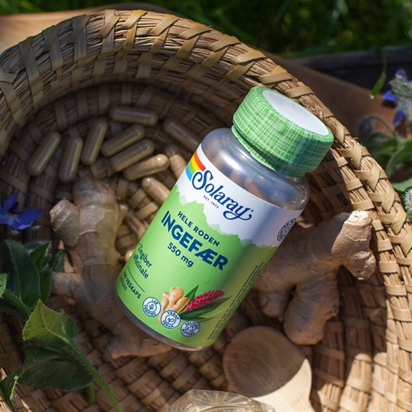 100 kapsler. Ingefær Solaray er et naturligt tilskud mod alderdommens små skavanker. Øger bevægeligheden. Kan indtages sammen med fiskeolie og gurkemeje. Gelatinekapsel fra kalv. Natur Energi.