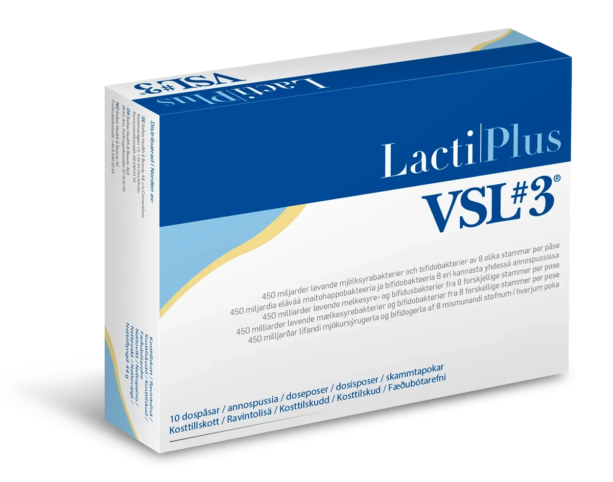 LactiPlus VSL#3 er et balanceret, højdosis bredspektrum probiotika med 450 milliarder levende mælkesyre- og Bifido bakterier fra 8 forskellige stammer og 3 forskellige familier til opretholdelse af mikrobiel diversitet i tarmfloraen.