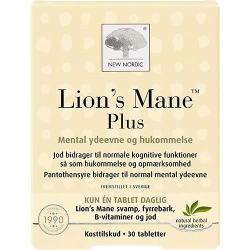 Lion’s Mane Plus Tabletter med svampeekstrakt, fyrrebark og vitaminer støtter kognitive funktioner og reducerer træthed.