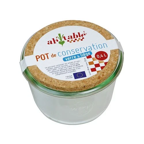 Opbevaringsglas med korklåg (Ø 10 cm, H 7,5 cm) – multifunktionelt til køkken, kontor og badeværelse. Tåler ovn, mikro og fryser (uden låg), genanvendeligt og bæredygtigt.