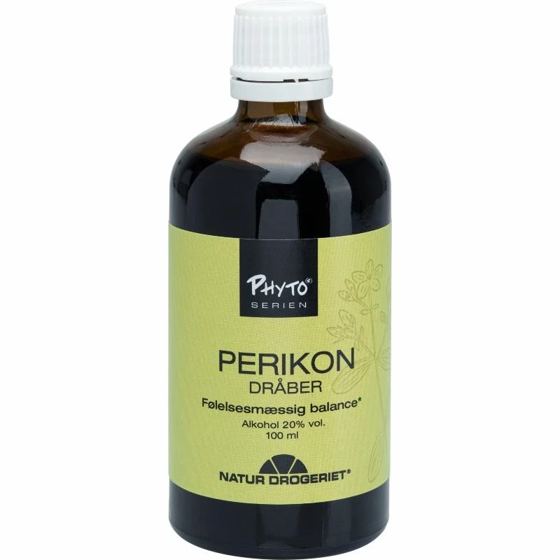 100 ml i glasflaske med dråbetæller. Kosttilskud. Perikon Dråber er flydende tinktur med et ekstrakt af perikon. Perikon bidrager til følelsesmæssig balance og generelt velbefindende. Alkohol anvendes som udtræks- og konserveringsfaktor. Bør ikke bruges af personer på antabus. Natur Drogeriet.