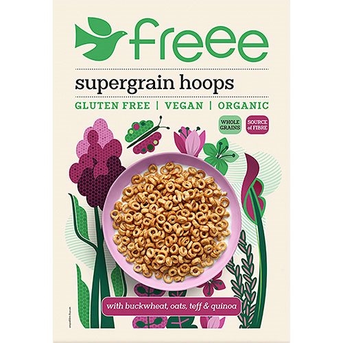 Doves Supergrain Hoops Glutenfri Økologisk med boghvede, teff og quinoa giver en sprød, vegansk smag til morgenmad eller snacks.