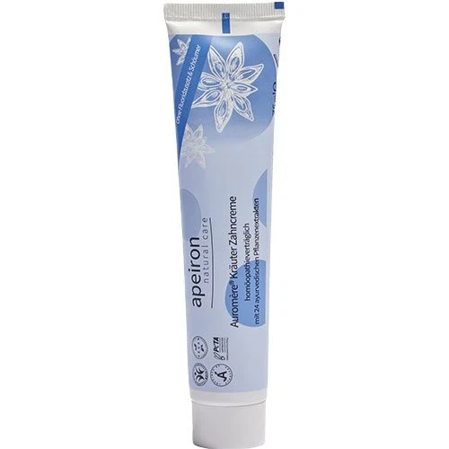 Auromère urte-tandpasta fra Apeiron (NatureSource) er en mild og naturlig tandpasta baseret på hele **24 forskellige planteekstrakter**. Den giver en skånsom og effektiv pleje af tænder og tandkød uden brug af mynteolie, eukalyptus eller mentol.